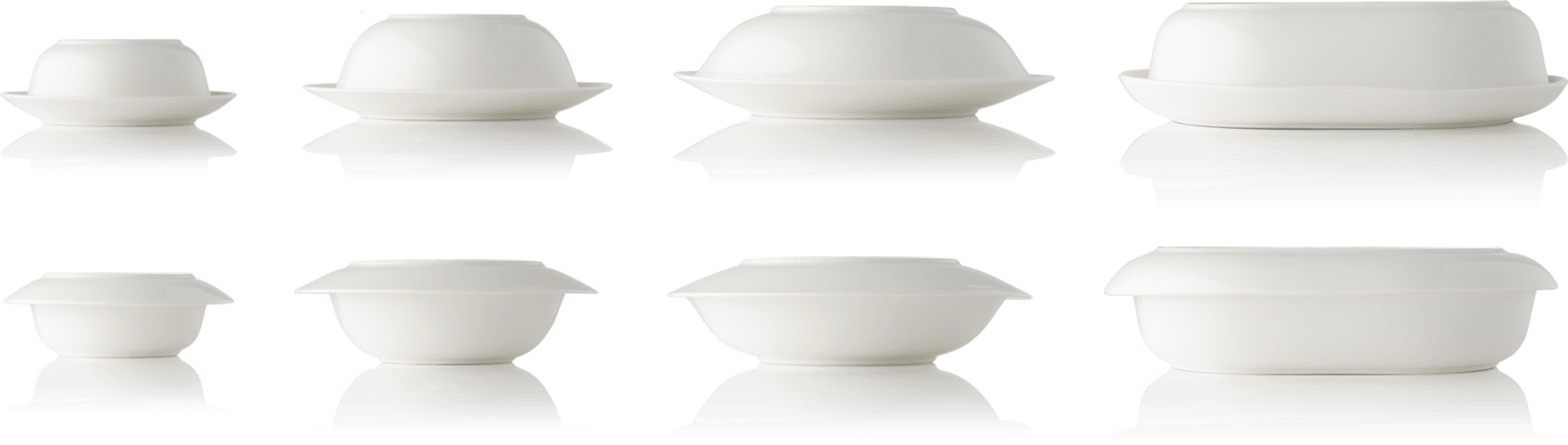 The “lid and cloche” design of the Everyday range allows bowls and plates to fit together for storage or reheating, without the need for plastic.