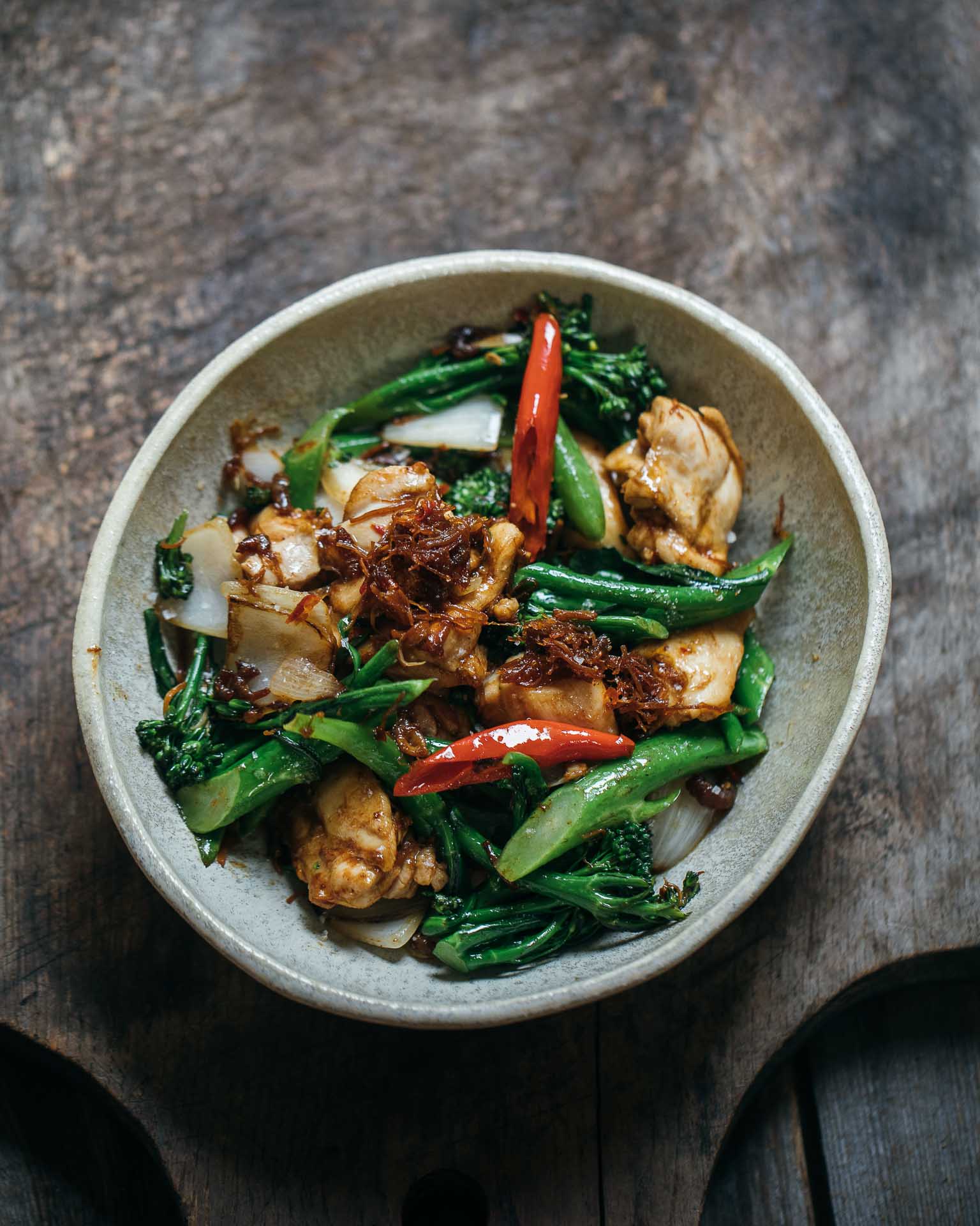 - Heat a little more oil in the wok and add the onion, garlic and chilli. Toss until the garlic is fragrant, then add the broccolini and toss until the broccolini is softened (about 3 minutes). Return the chicken to the wok and season well with salt. Add the Shaoxing wine and XO sauce and toss to combine. Drizzle in a little cornflour mixture while tossing the wok until the XO sauce sticks to the chicken and broccoli. Remove from the wok and serve.