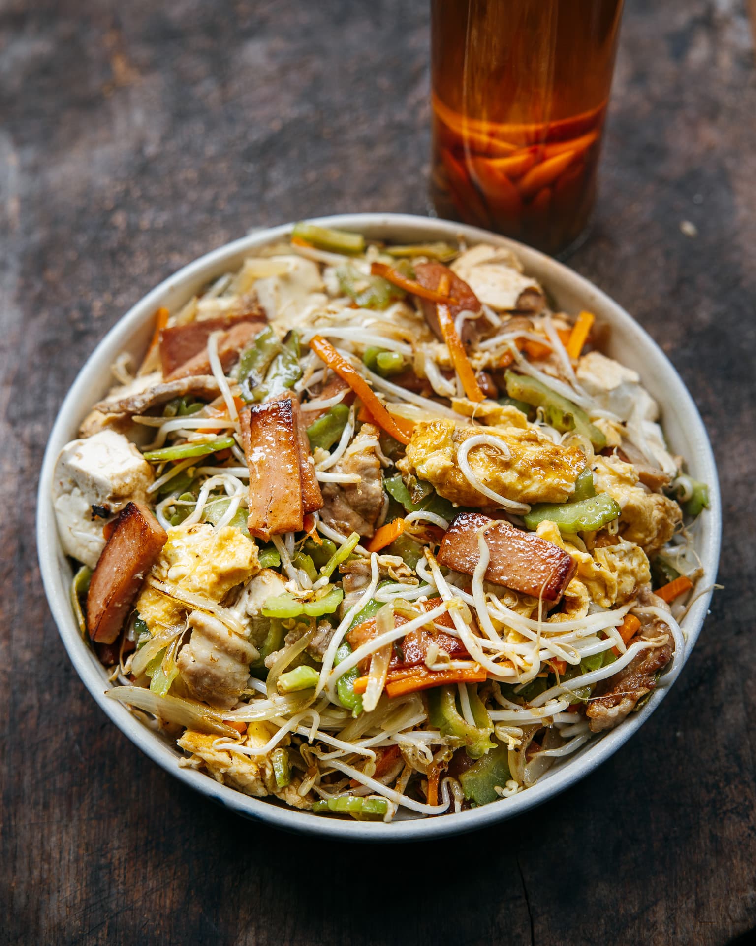 - Return the wok to the heat, add any remaining oil and fry the eggs until just set. Return the fried ingredients to the wok, add the beansprouts, then season with salt, soy sauce, sake, sugar and bonito flakes. Toss to combine, then remove from the wok and add a little more bonito flakes on top. Serve with koregusu (Okinawan chilli fermented in awamori).