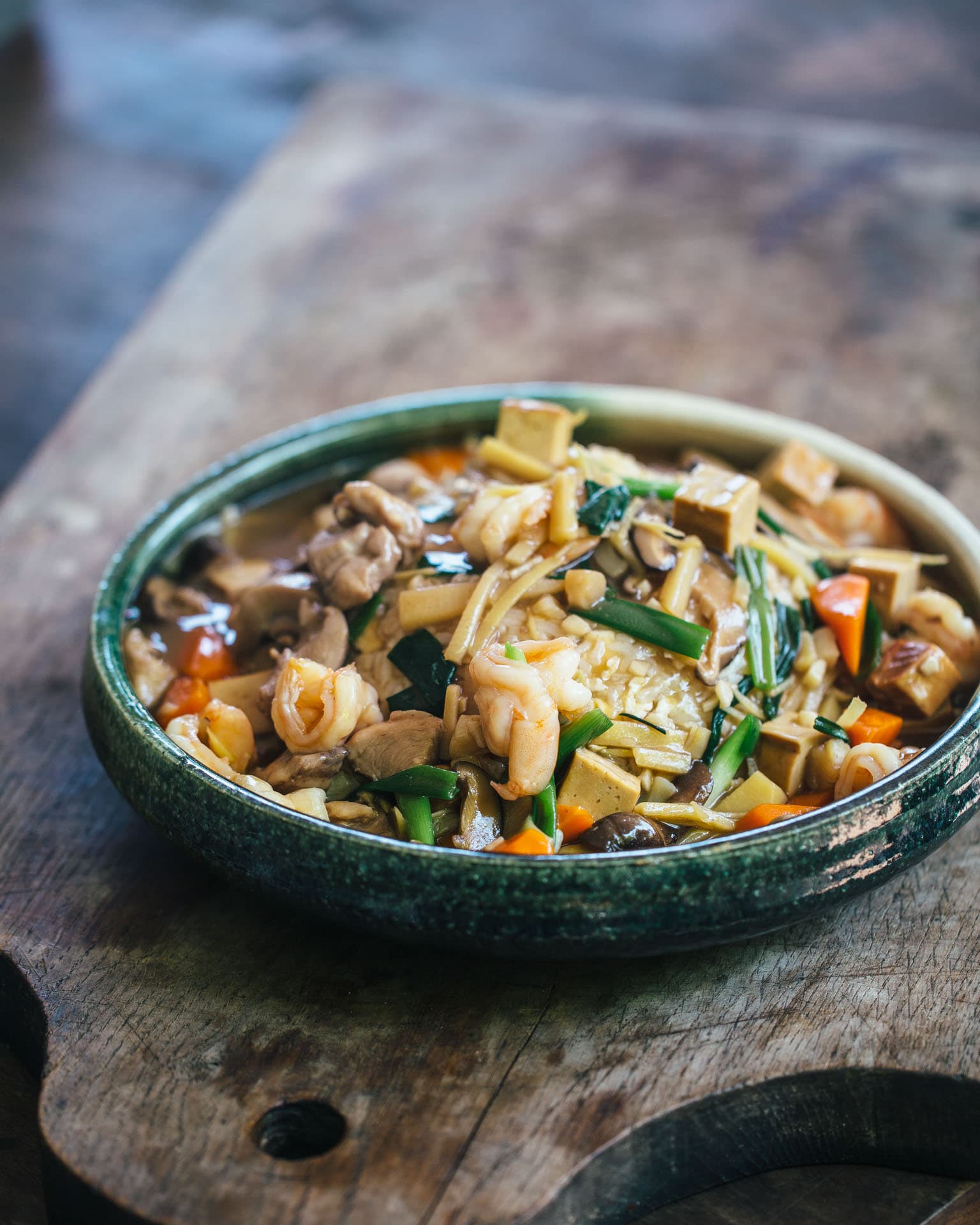 - Return the wok to the heat and add the remaining oil. Add the garlic and ginger and toss for a few seconds until fragrant. Add the chicken and toss to coat in the fragrant oil. Add the onion, carrot, bamboo shoot, mushrooms, scallops and tofu. Toss for a minute or two and then add the reserved liquid from soaking the mushrooms and scallops, oyster sauce, soy sauce, Shaoxing wine, sugar and enough chicken stock to make a braising base. Simmer for about 5 minutes, then add the prawns and simmer for a further minute. Taste and adjust seasoning if necessary. Mix the cornflour with some cold chicken stock or water and stir the mixture through the braise to thicken it to a silky consistency