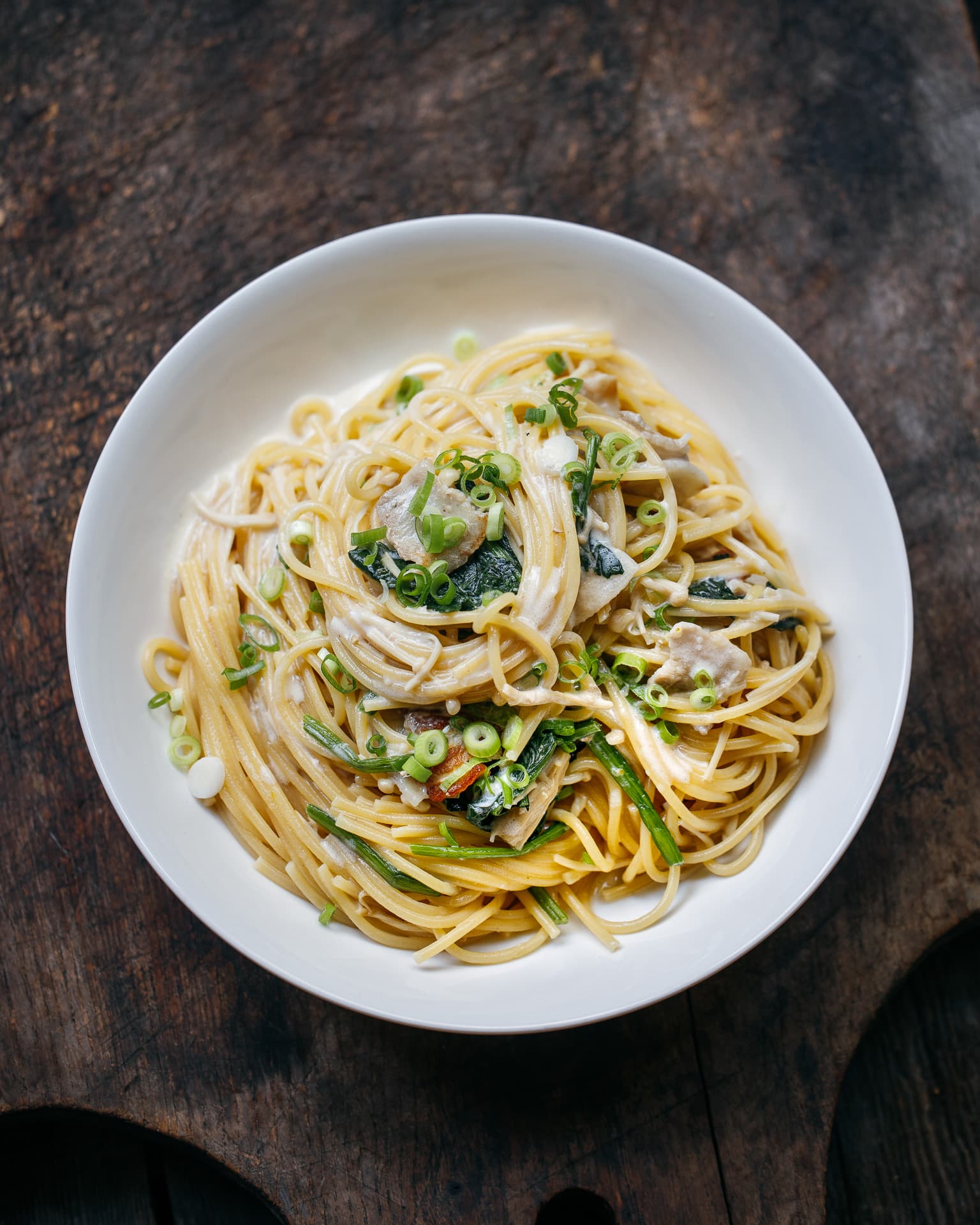 - While the pasta is cooking, heat a large frying pan over medium heat and add the oil. Add the pork belly and garlic and fry until lightly browned. Add the cream, yuzu kosho, and about 1 cup of the pasta water. Add the pasta when it is al dente, and stir to form a sauce around the consistency of pouring cream. Stir through the spinach, then scatter with the spring onions to serve.