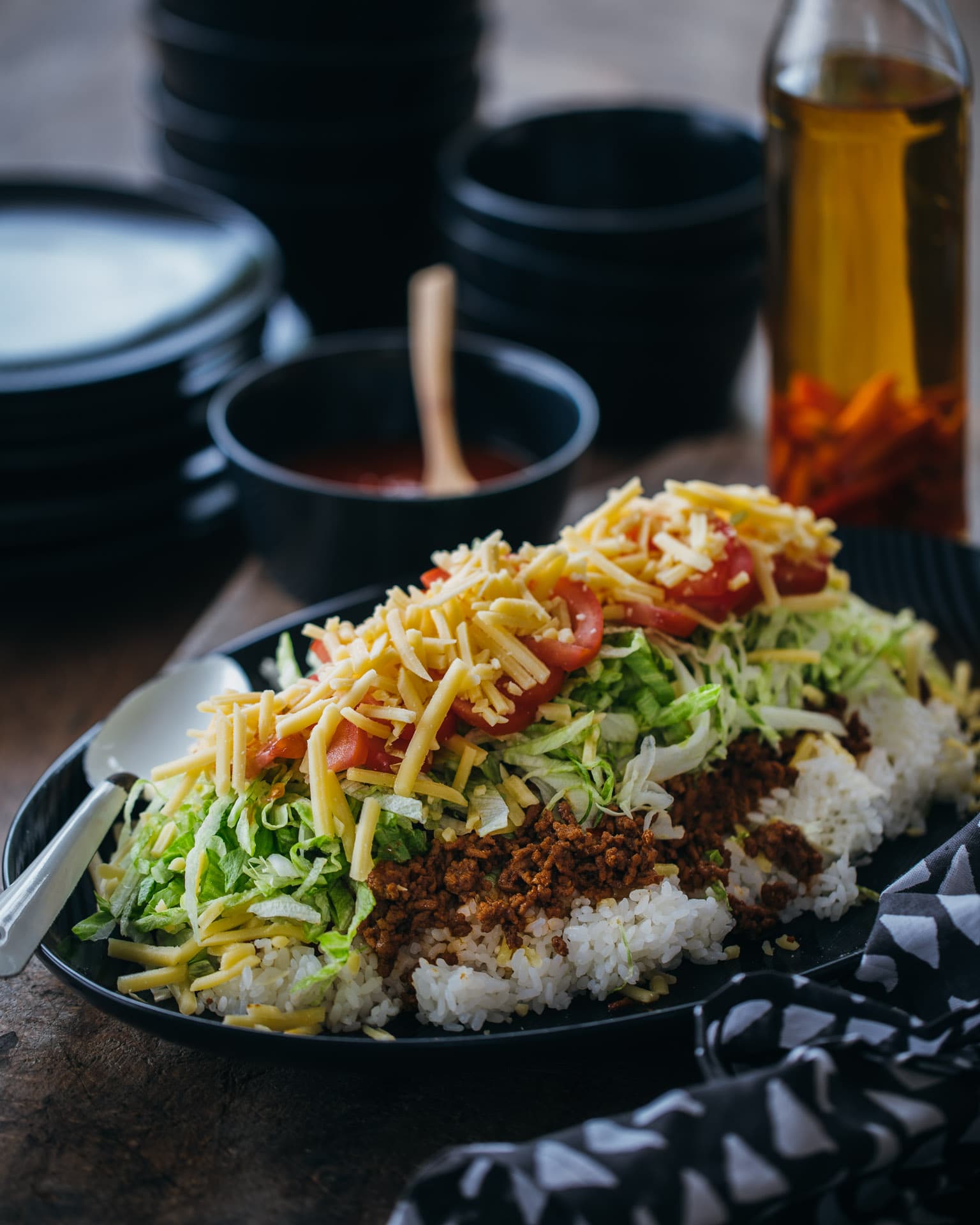 This is the most authentic and simple version of this dish – made with packet taco seasoning and jarred salsa, just like it’s made in Okinawa. This version is as close as it comes to a piece of history, and is still what’s served at my favourite taco rice place, King Tacos, which Gibo opened as a permanent home for his now-iconic dish.