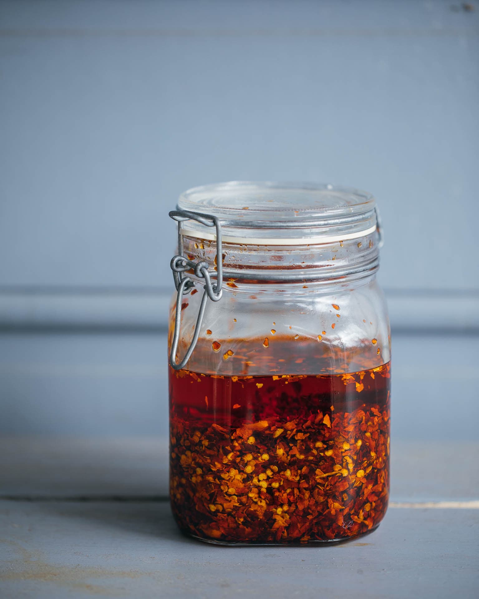 - Allow the oil to cool for about 10 minutes to around 120C, and then add the dried chilli flakes. Allow the oil to cool completely for about 1 hour, and then transfer the chilli oil to a jar. The chilli oil will keep at room temperature for years.
