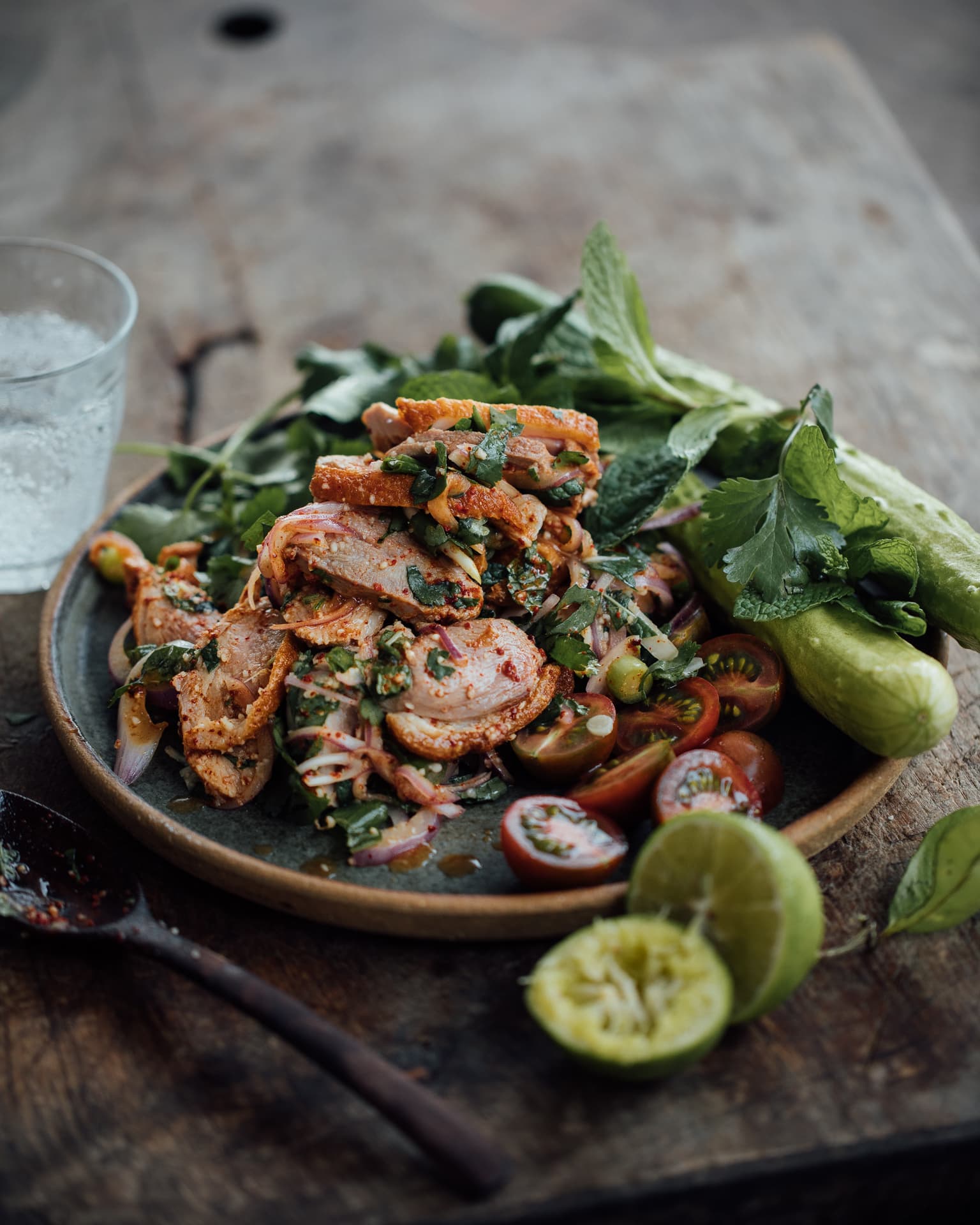 Nam tok is a lot like a larb, in the sense that it is a spicy, meaty salad. The big difference is that the duck is grilled rather than simmered or raw (as some larbs are made).